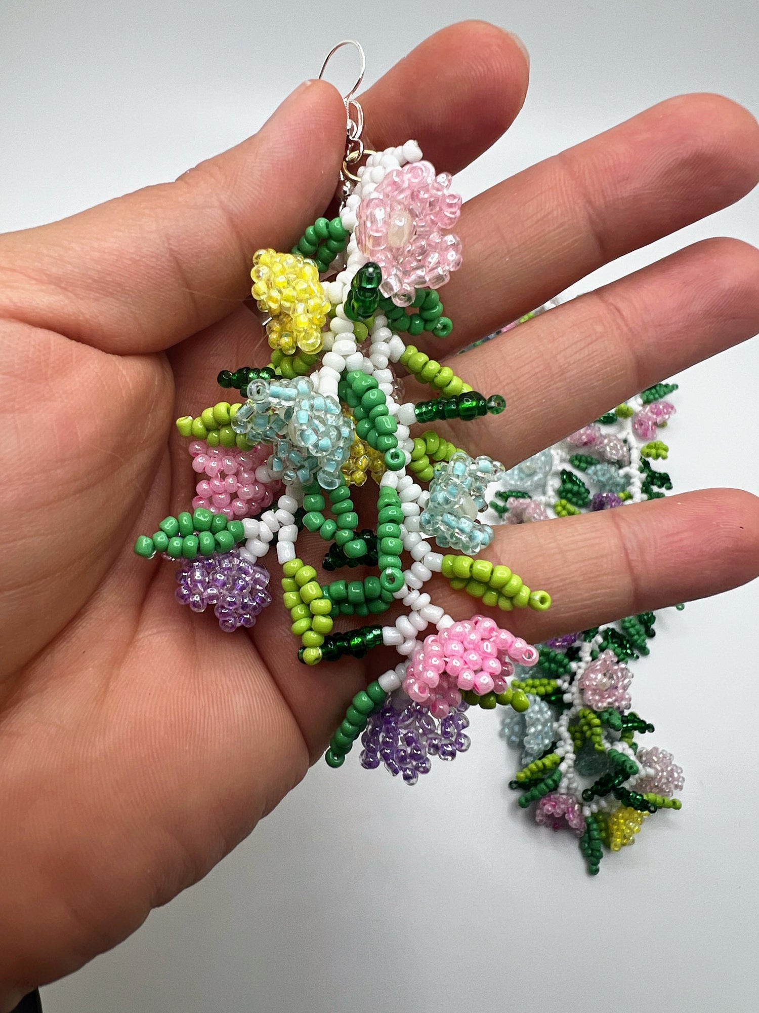 Adorn yourself with the beauty of a blooming garden with this stunning, meticulously handcrafted jewelry set. Each piece features a vibrant array of individually beaded flowers in various hues—pinks, blues, yellows, purples, and whites—intertwined with lush green foliage, creating a delicate garland effect.