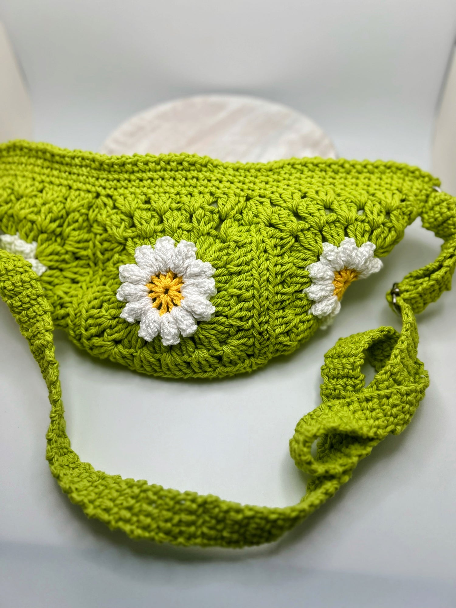 Handmade Crochet Cross Body Green with White Flower Bag with Adjustable Strap – Stylish & Practical