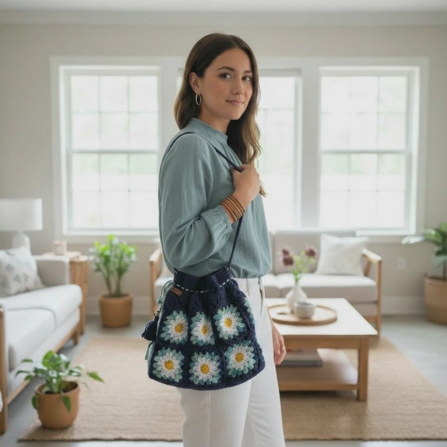 Brighten up your outfit with this Handmade Daisy Flower Crochet blue Bag, perfect for girls and teens who love a blend of cute and stylish accessories. Crafted with soft yarn and featuring a cheerful sunflower design, this lightweight bag is ideal for casual outings, school, or special occasions.