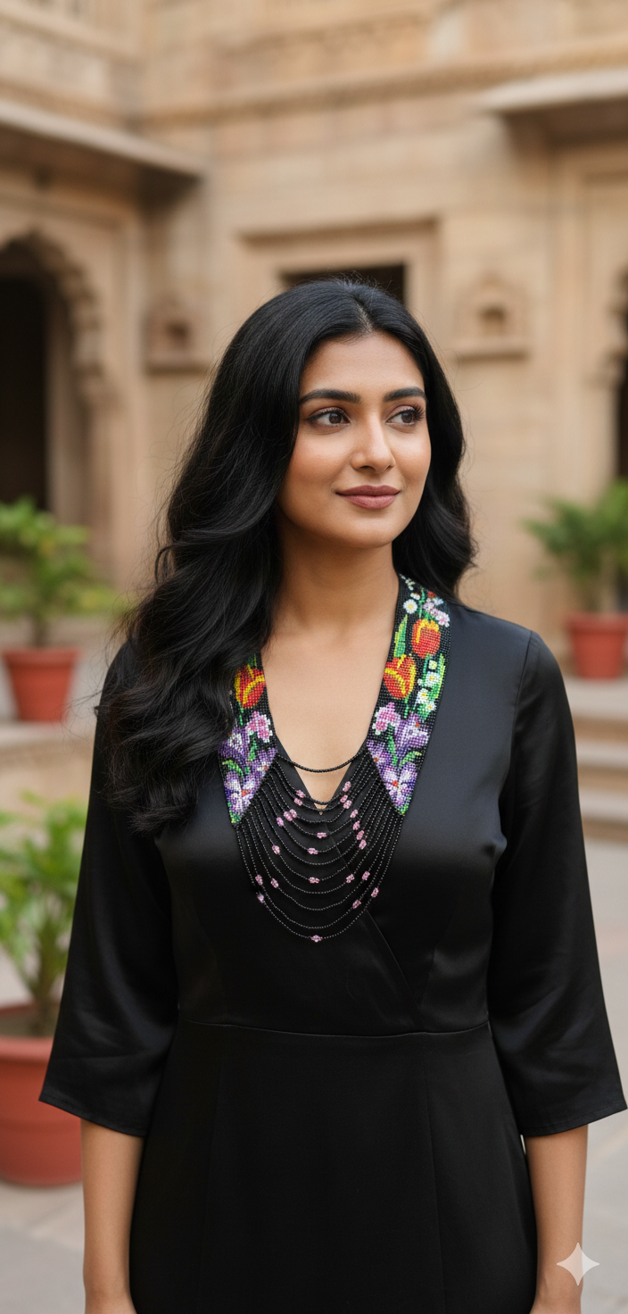 🎨 Intricate Loom‑Bead Floral Pattern: Purple and pink blossoms set against a crisp background, meticulously woven with traditional beading techniques